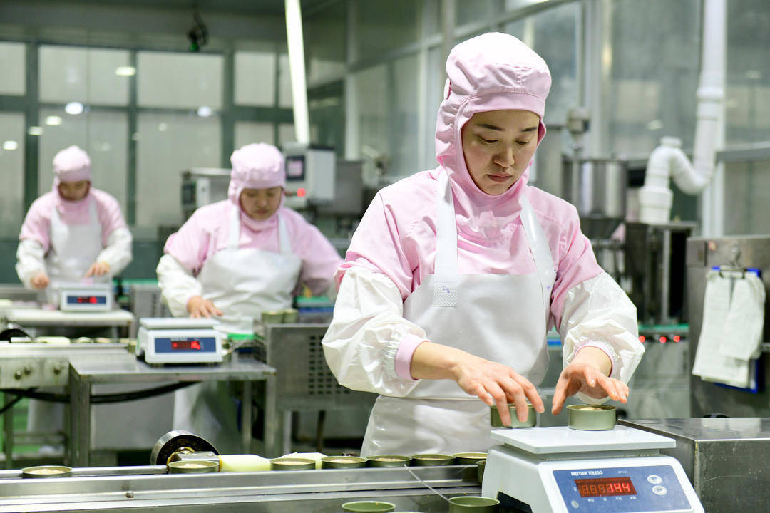 正在中誉宠物食物(菏泽)有限公司,使命职员对宠物食物实行称重。(新华社发)