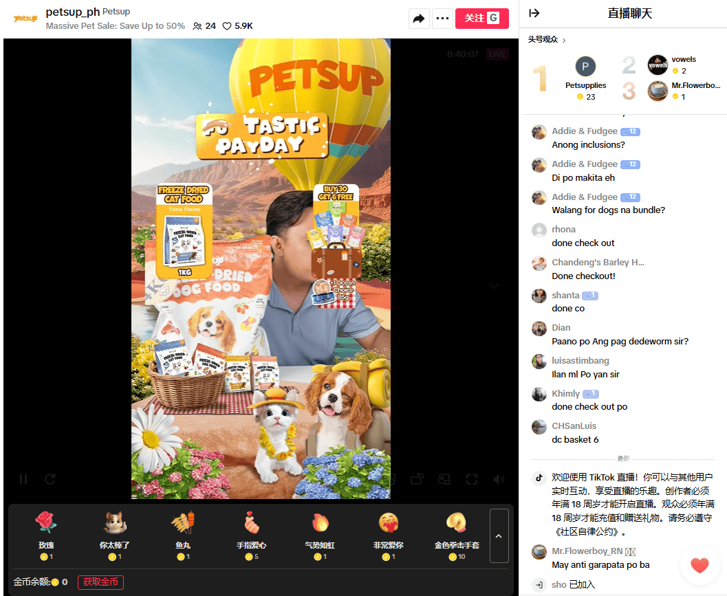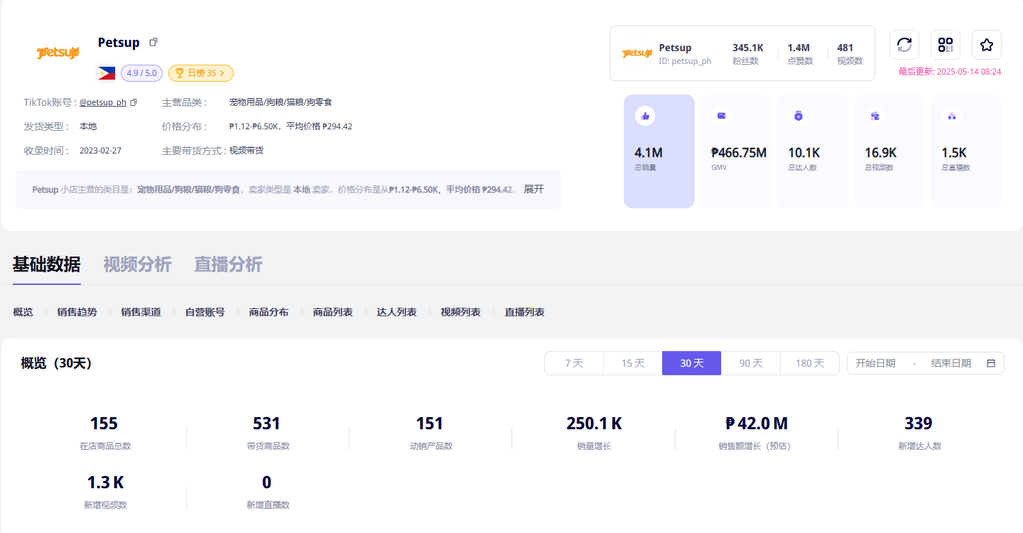 遵照TikTok电商数据东西Echotik显示,Petsup已与超10000名达人筑设团结相干,过去30天新增带货达人339人,累计带货视频1300+条。此中粉丝量为18.8万的达人@elpidioherviassr,光靠直播Petsup产物就卖出了10万件产物,另一位达人@princessthekikaydog,带来的GMV更是高达555万比索(约合71.4万元黎民币)。