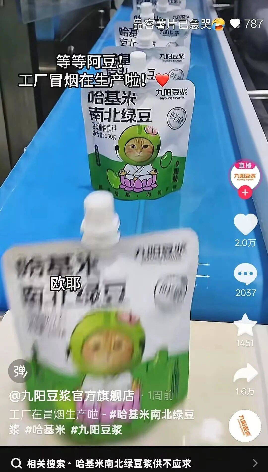 另外,九阳豆业正在包装上大面积运用了猫咪地步,把这杯豆乳彻底塞进了“猫猫宇宙”。产物上新前后,官方账号同步用“哈基米南北绿豆”改编 BGM 做宣称,直播间轮回播放同款音乐,话术里不停夸大“梗味”,让用户正在短视频里看到的,不是一款功效性饮品,而是一只拟人化的猫、一句熟练的歌词和一杯“能够喝到的梗”。